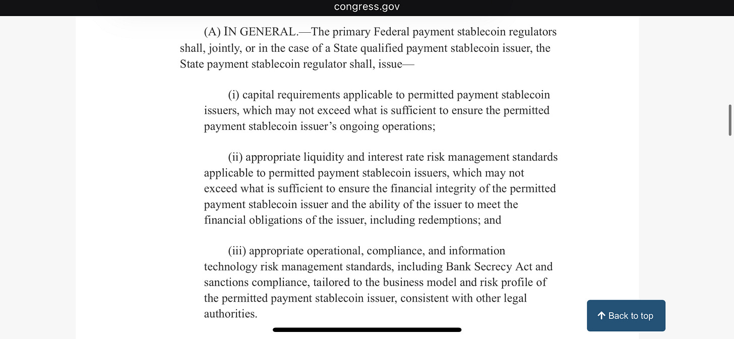 The capital reserve requirements laid out in this bill provide a clear incentive for stablecoin issuers to buy government debt. Thus, any corporation can mint their own legal tender as long as they back their digital asset 1:1 with U.S. Treasury Bonds.